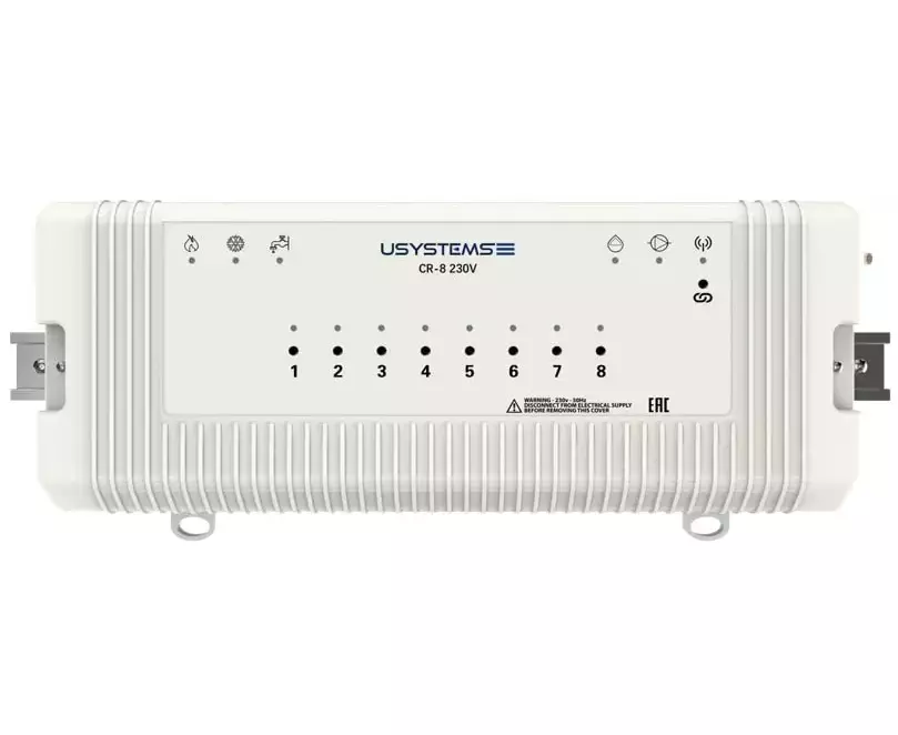 Беспроводной контроллер системы автоматики для автоматического управления системой водяного отопления. Для питания и управления максимум 8 комнатными термостатами 230 В (8 зон) и 48 исполнительными механизмами 230 В, а также реле насоса, реле котла и реле клапана ГВС.