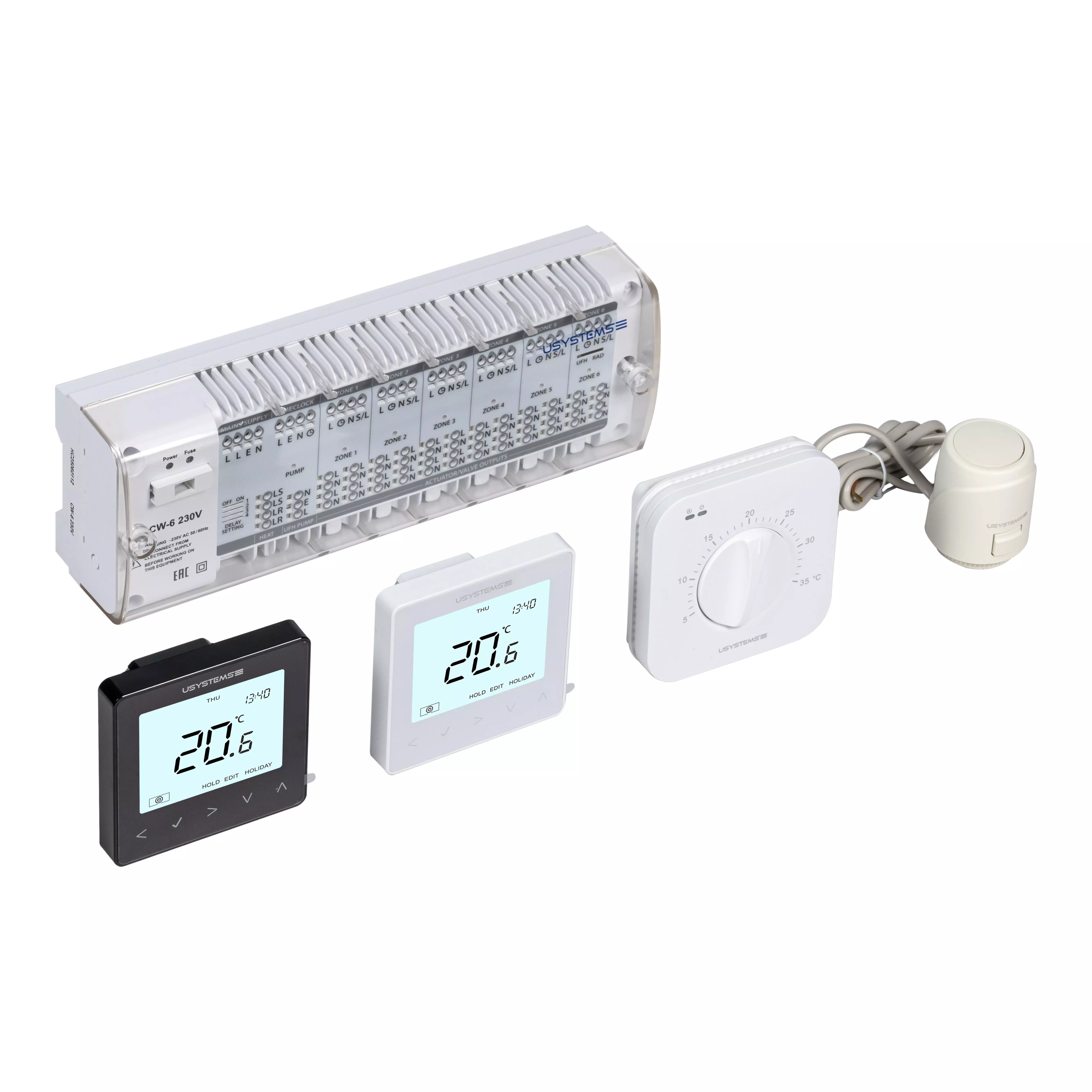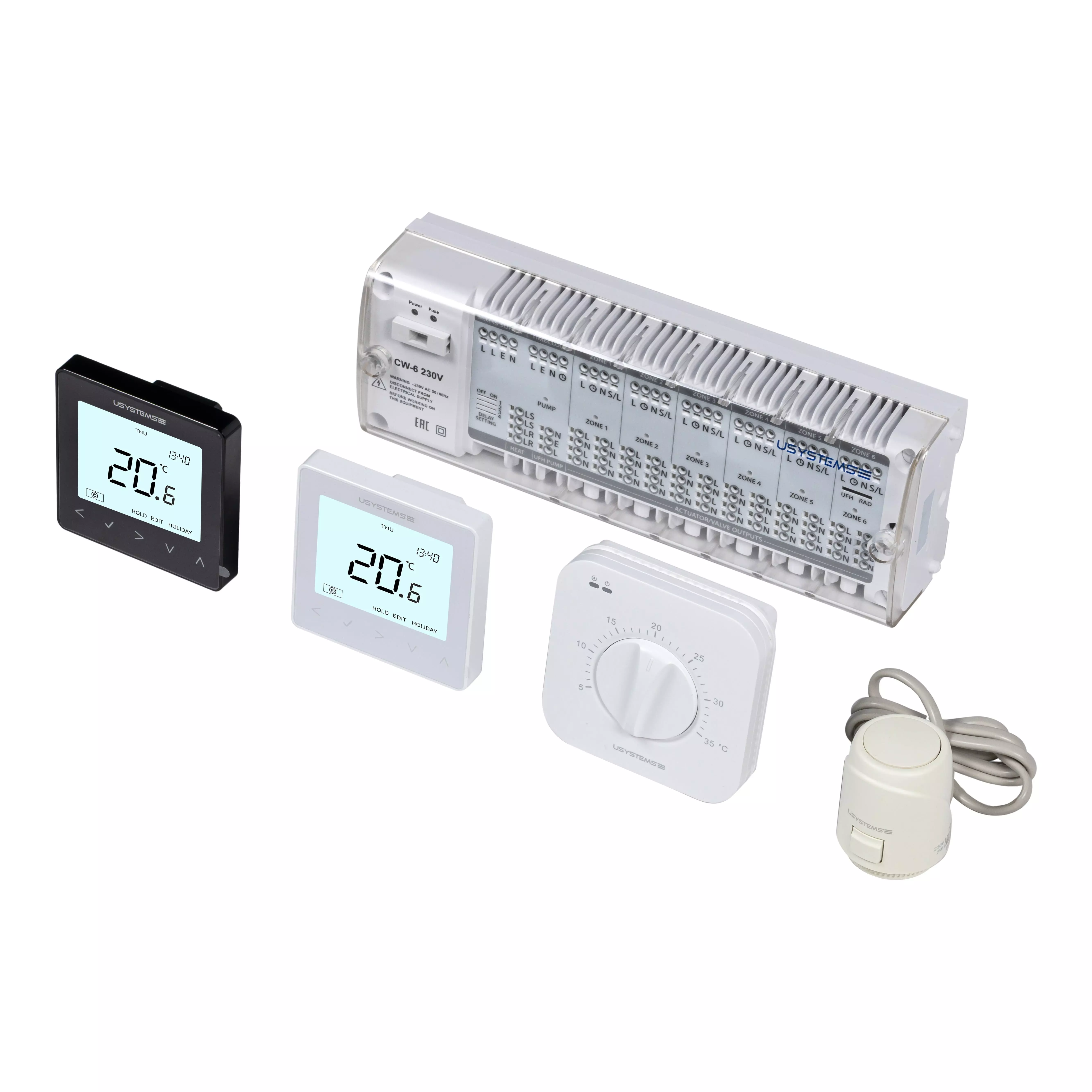 Цифровой программируемый термостат 230 В с функциями экономии энергии и работы по расписанию. Подключается к контроллерам CW-6 и UH-8 или напрямую к исполнительному механизму 230В.