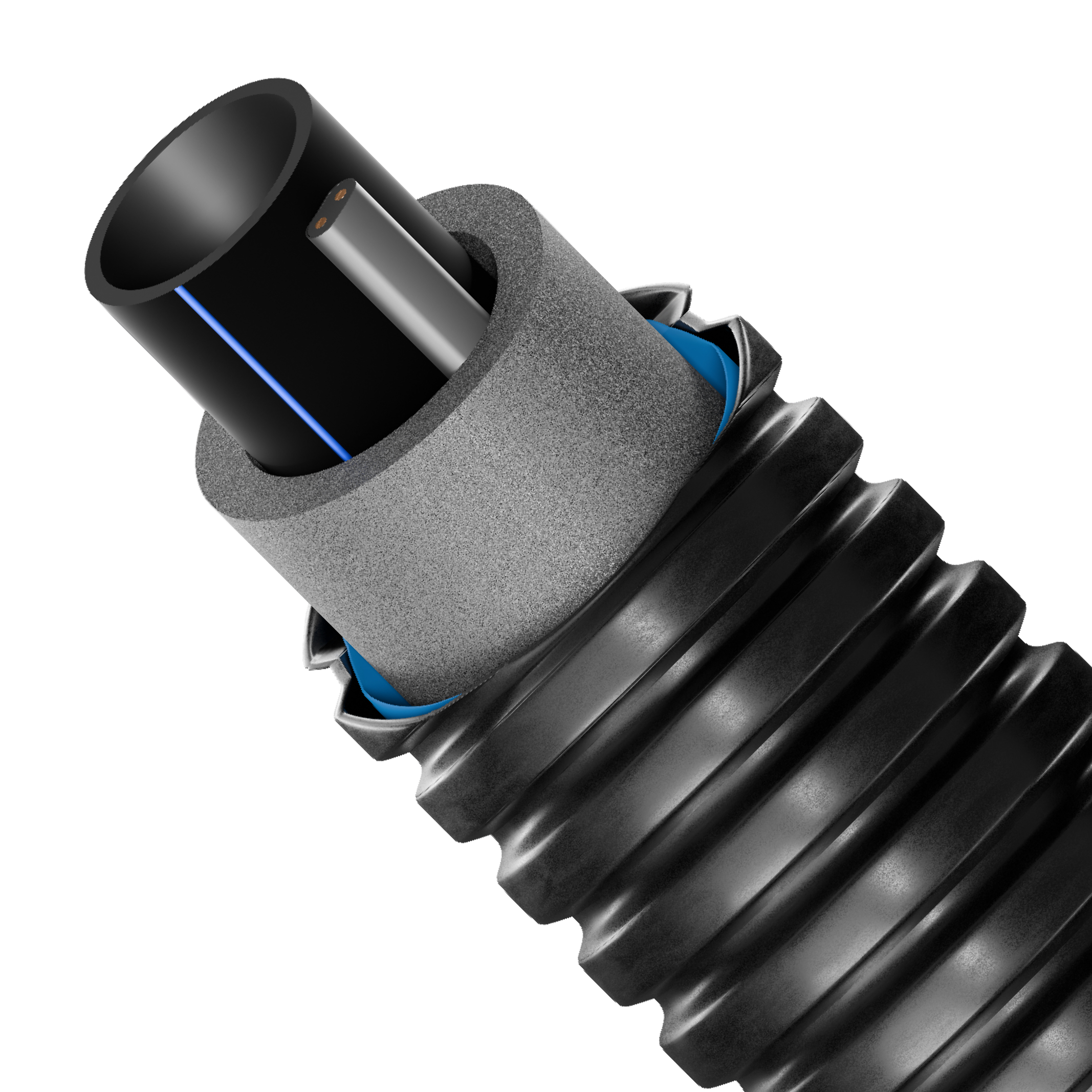 Теплоизоляционный слой выполнен из вспененного сшитого полиэтилена PE-X с закрытыми порами. Материал устойчив к старению, сохраняет эластичность и имеет водопоглощение менее 1%. Защитный гофрированный кожух из полиэтилена высокой плотности HDPE обеспечивает сохранность изоляции и кабеля при укладке в грунт.