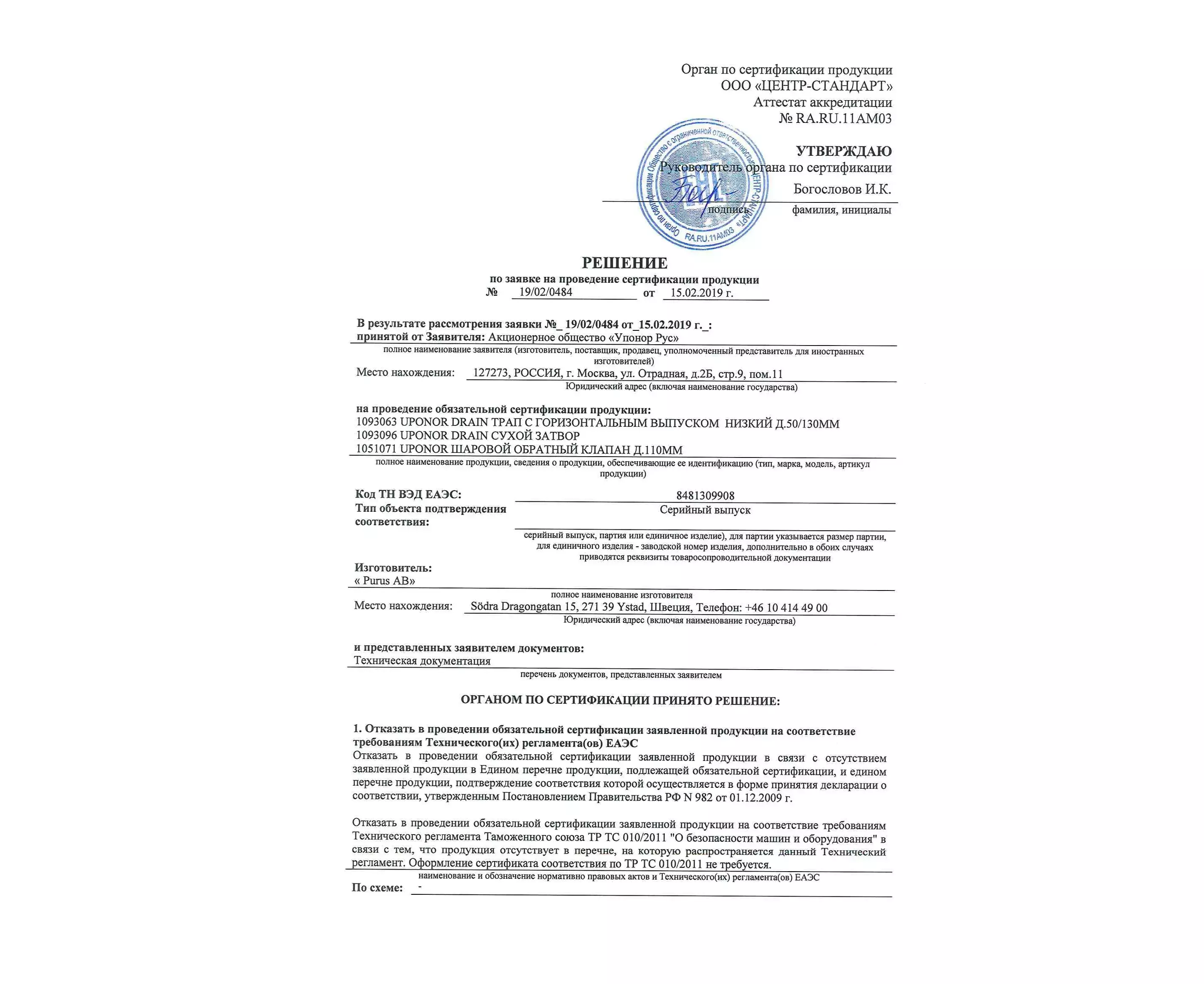 трап Uponor Drain с горизонтальным выпуском низкий, 50