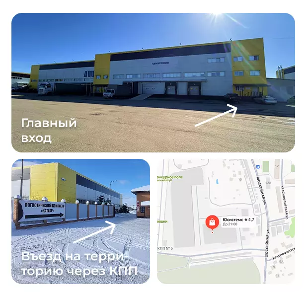 Самовывоз Въезд через КПП по паспорту. При выезде получите у сотрудника склада АО «Юсистемс» пропуск на выезд.