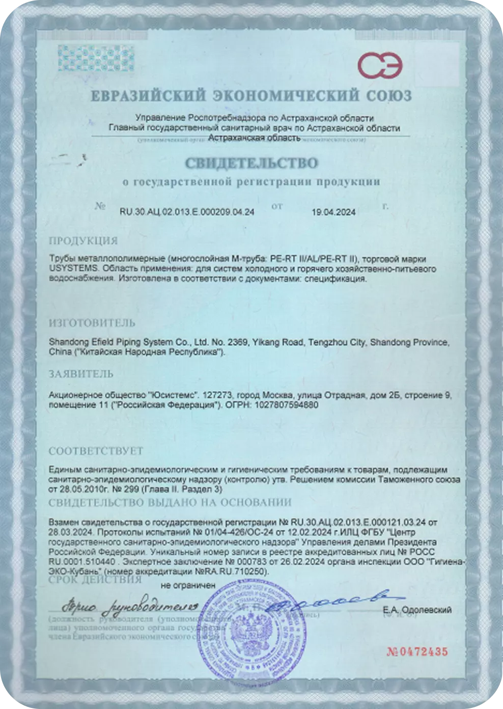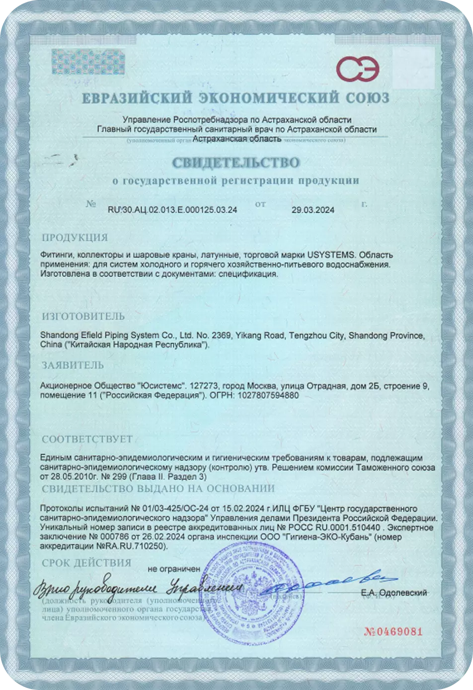 Продукция предназначена для систем холодного и горячего хозяйственно-питьевого водоснабжения. Сертификаты выданы на основании протоколов испытаний и экспертных заключений аккредитованных органов. Срок действия сертификатов не ограничен.