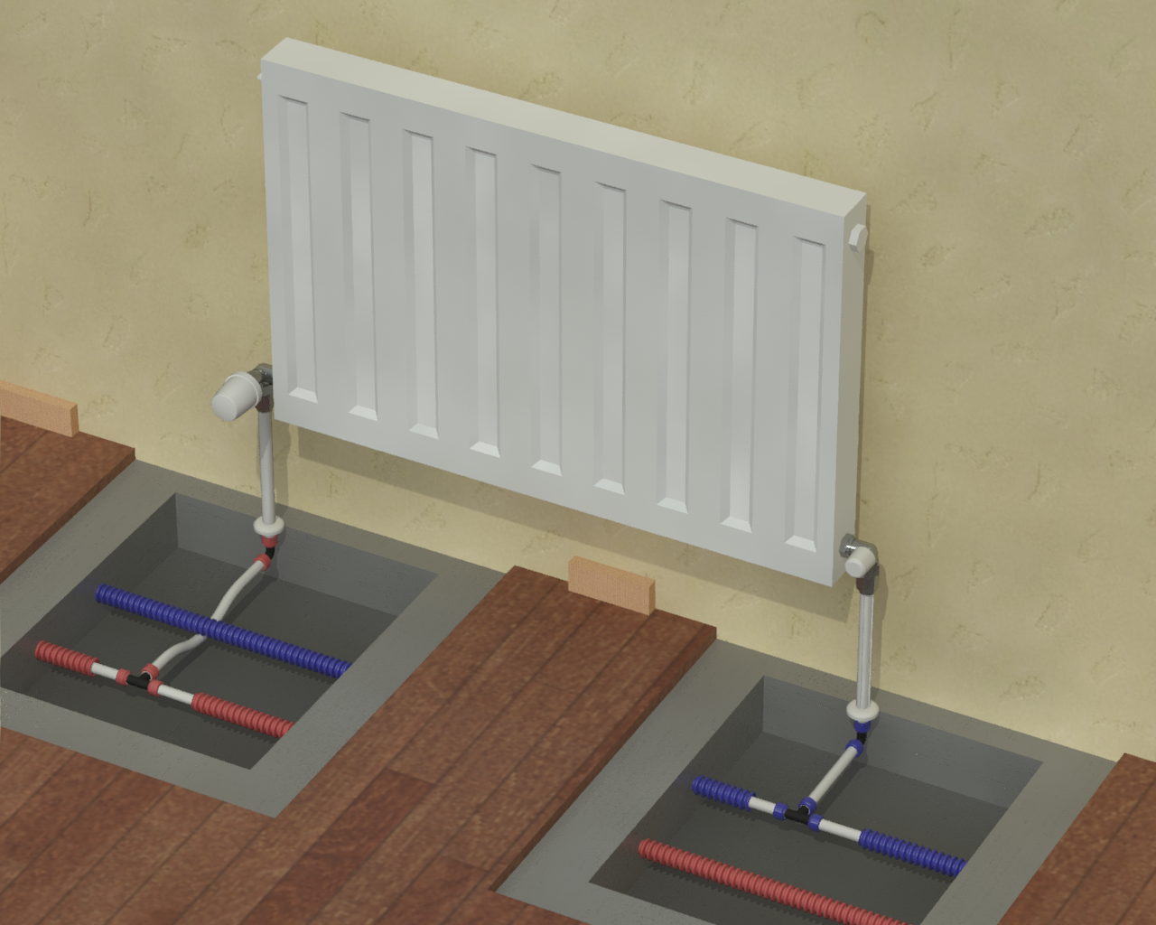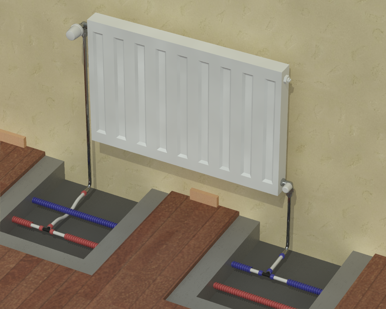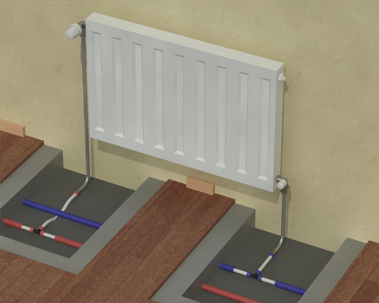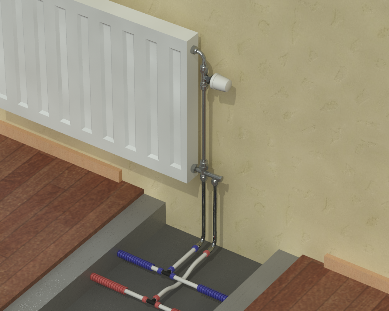 Раздел представляет схемы, чертежи и инструкции по монтажу различных вариантов подсоединения радиаторов (боковых, нижних, внутрипольных).