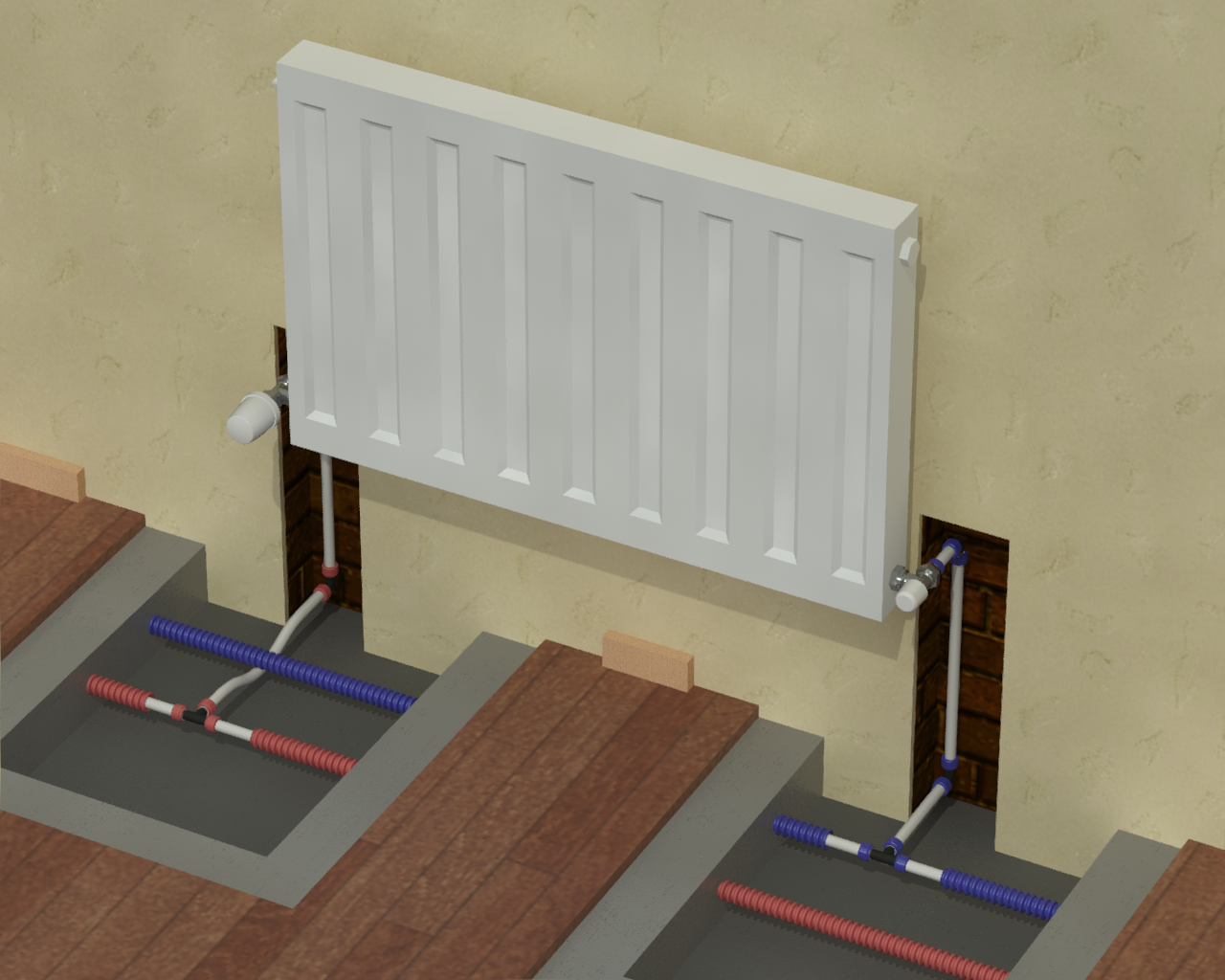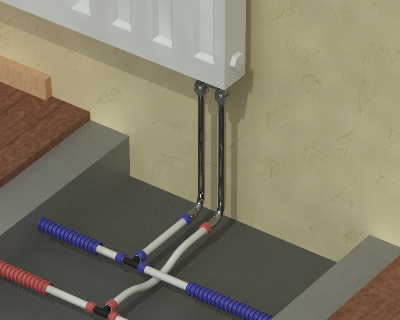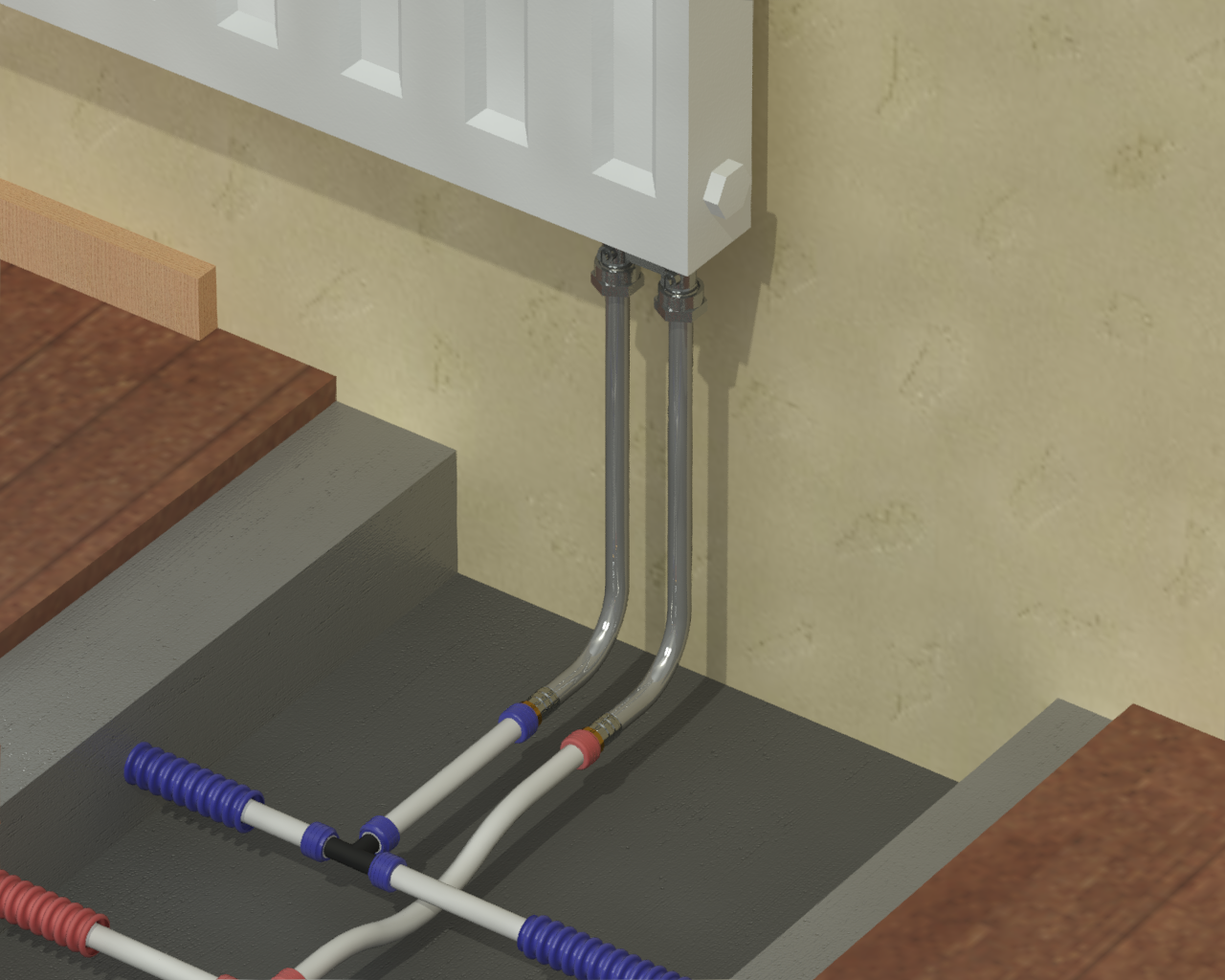 Раздел представляет схемы, чертежи и инструкции по монтажу различных вариантов подсоединения радиаторов (боковых, нижних, внутрипольных).