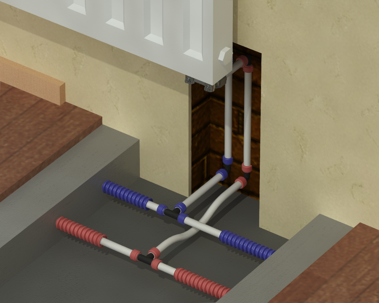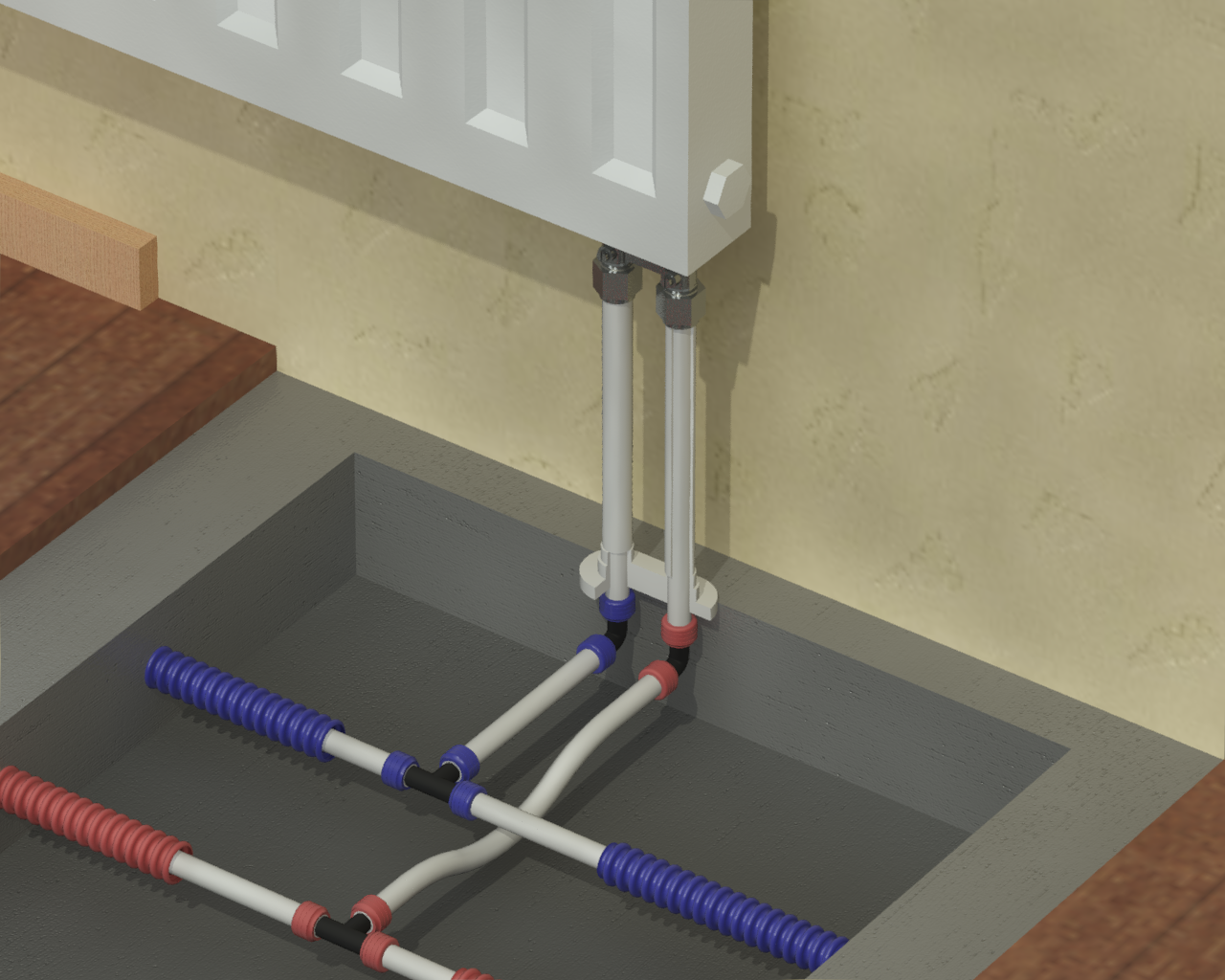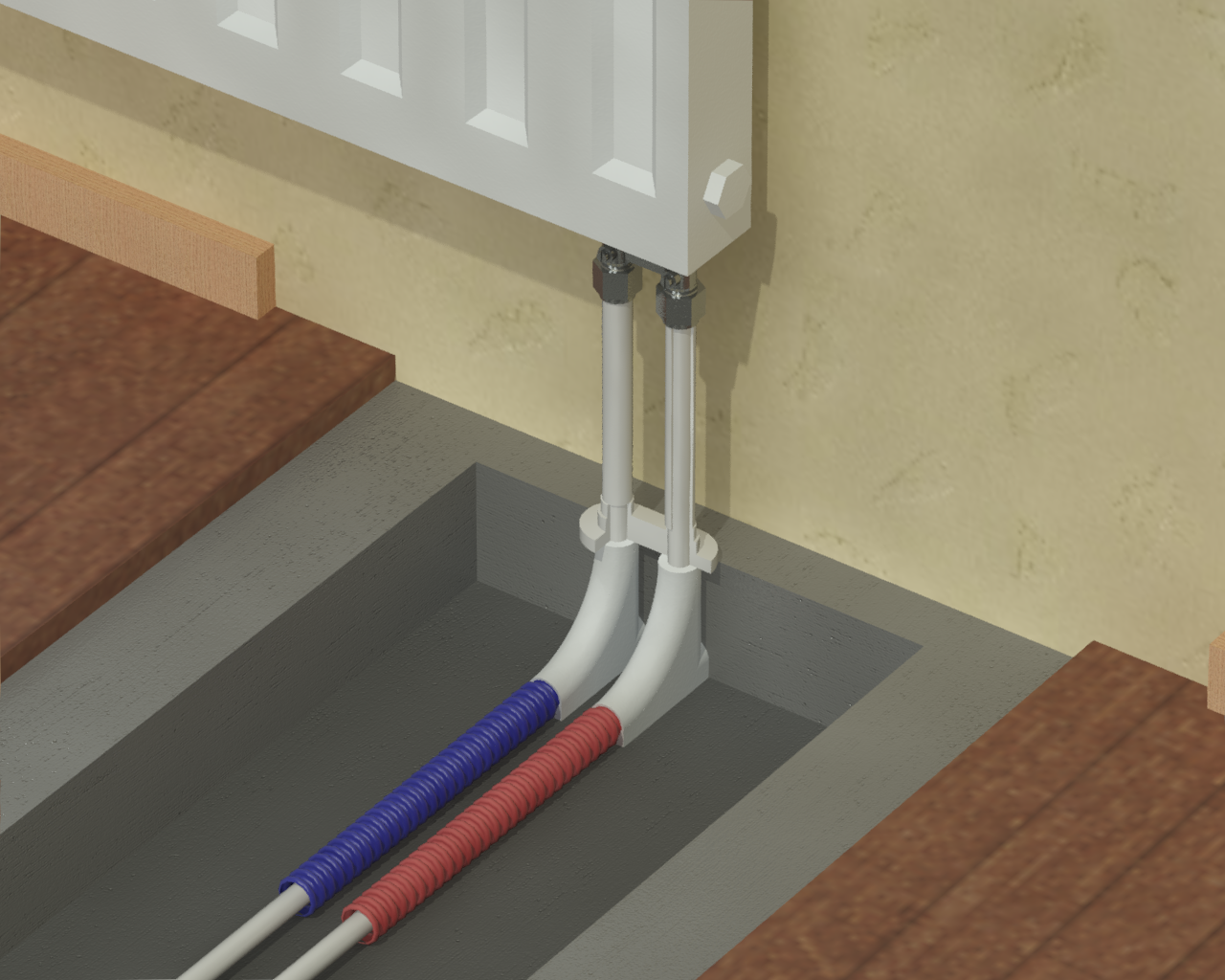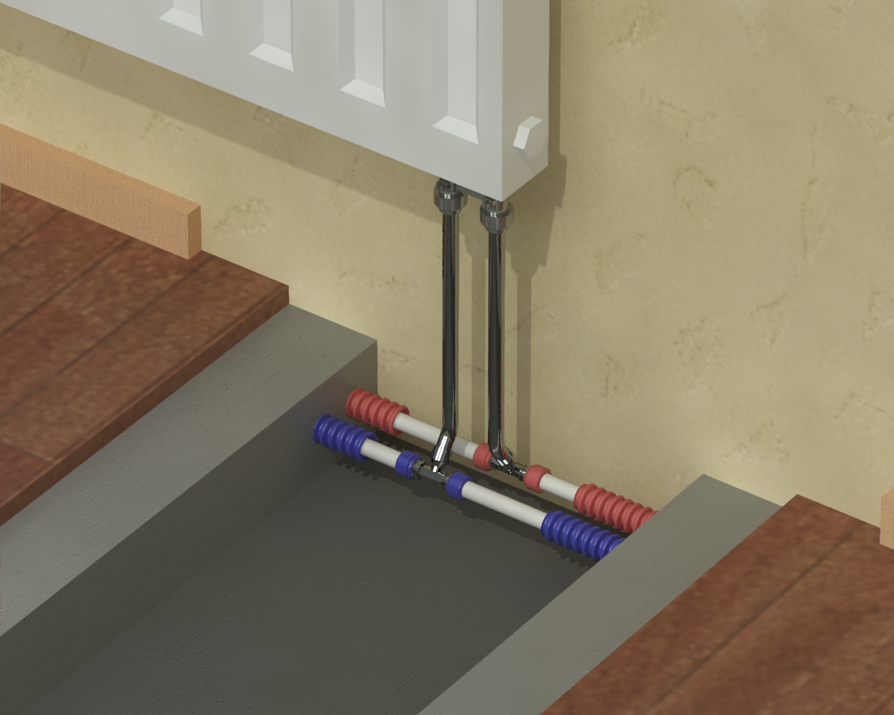 Раздел представляет схемы, чертежи и инструкции по монтажу различных вариантов подсоединения радиаторов (боковых, нижних, внутрипольных).