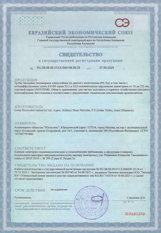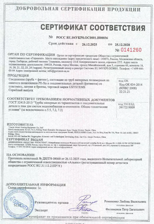 Сертификаты подтверждают, что трубы USYSTEMS безопасны для использования в системах хозяйственно-питьевого водоснабжения. Продукция предназначена для использования в системах холодного и горячего водоснабжения, обеспечивая долговечность и эффективность решений для инженерных коммуникаций.
